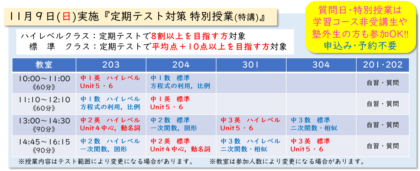 また、11月9日(日)には『テスト対策特別講座(英数)』を開講します。(参加無料)